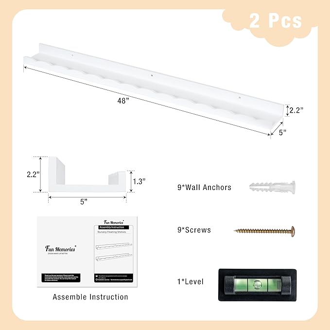 • 【Large Storage Space Nursery Shelves】Enhance your nursery space with these versatile floating ledge shelves. Kids can effortlessly store books, toys, stuffed animals, and games on these wall-mounted shelving units. Each nursery wall shelf measures 48×5×2 inches, and this set includes two packs for added convenience.