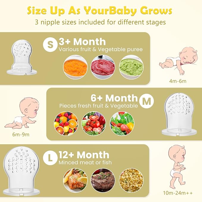 • 【ALL SIZES INCLUDED-Accompany with Your Baby Growth】:small, medium and large three sizes sacs are included in the fruit feeder package to fit different month age baby, S for 4-6 months, M for 6-10 months, L for 10 months+, you can choose the suitable size for your baby at different months.