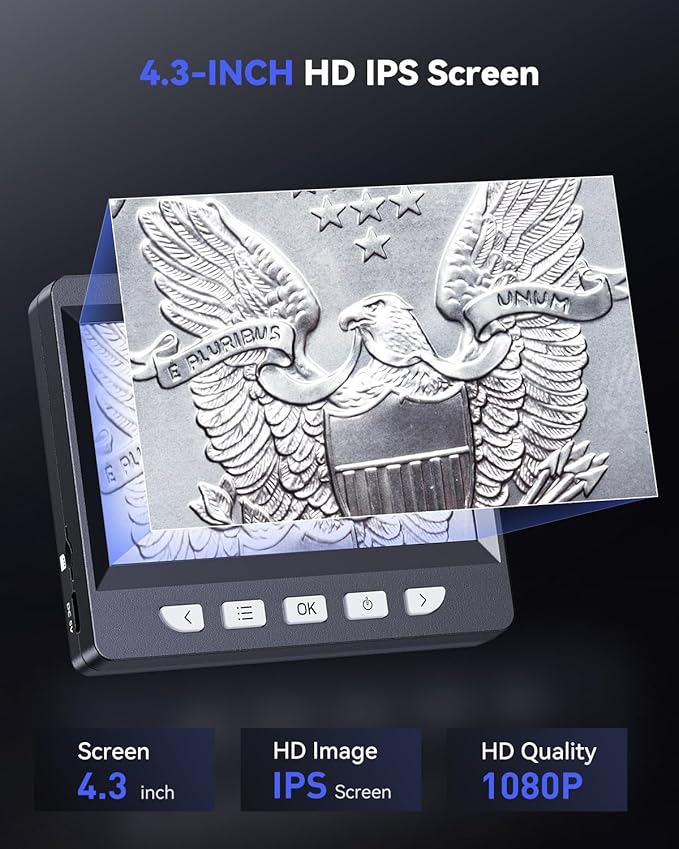 • 【Stunning Display】 - Immerse yourself in a visual feast with our coin microscope 4.3-inch HD LCD screen with 8 adjustable lights boasting over 10 million pixels. Reduce the pressure on your eyes and give your eyes a more comfortable visual experience
