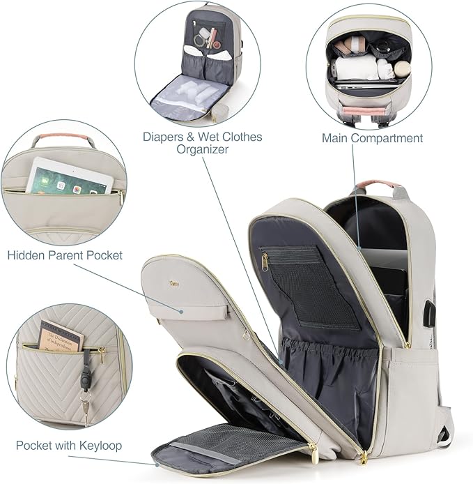 • Convenient and Thoughtful: Baby diaper bag features 15.6’’ padded laptop pocket and 12.9’’ iPad pocket in the main compartment, USB charging port, 2 built-in stroller straps, waterproof pocket, back anti theft pocket, dual zippers for easy access and closure even with one hand! Also we have added a luggage sleeve on the back so it can easily slide over a carryon luggage while on the go.