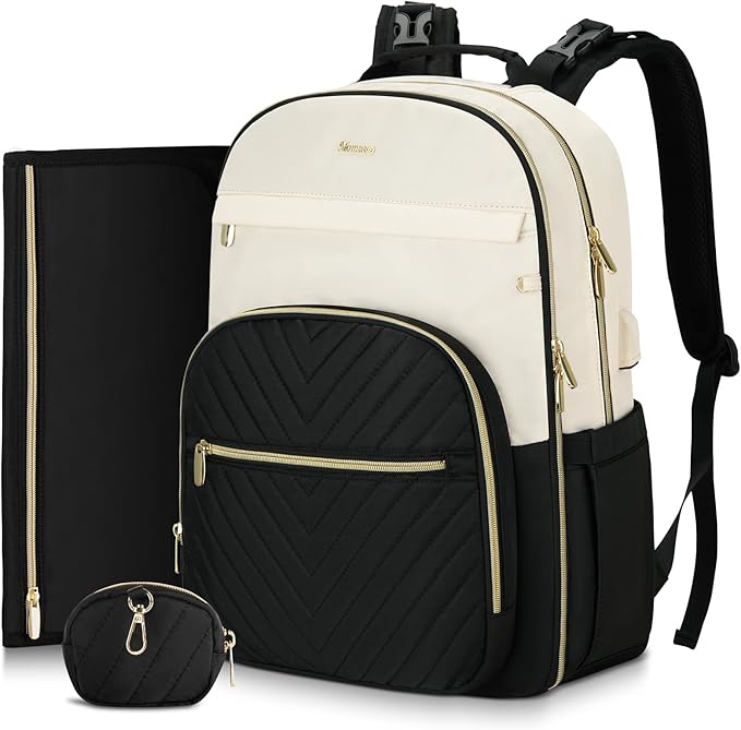 • Convenient and Thoughtful: Baby diaper bag features 15.6’’ padded laptop pocket and 12.9’’ iPad pocket in the main compartment, USB charging port, 2 built-in stroller straps, waterproof pocket, back anti theft pocket, dual zippers for easy access and closure even with one hand! Also we have added a luggage sleeve on the back so it can easily slide over a carryon luggage while on the go.