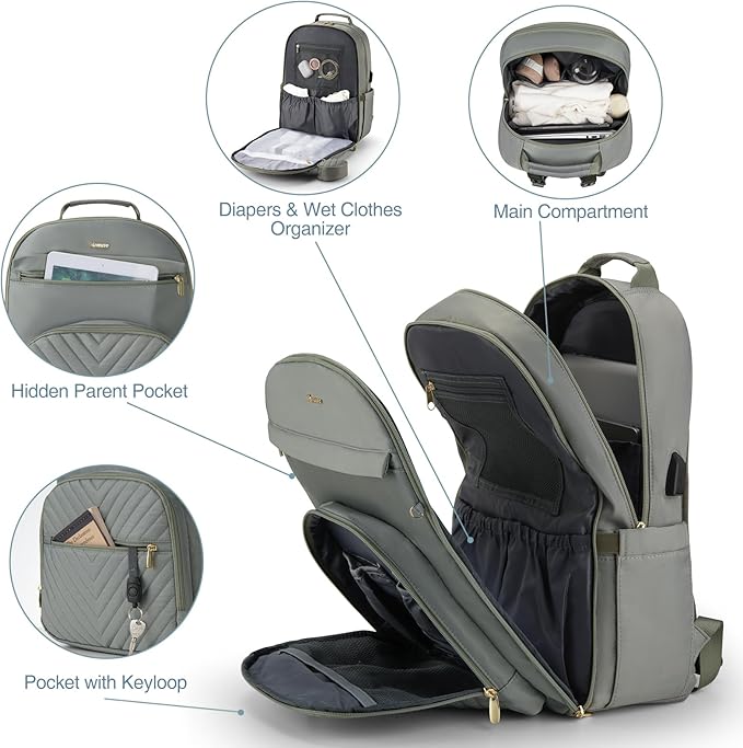 • Convenient and Thoughtful: Baby diaper bag features 15.6’’ padded laptop pocket and 12.9’’ iPad pocket in the main compartment, USB charging port, 2 built-in stroller straps, waterproof pocket, back anti theft pocket, dual zippers for easy access and closure even with one hand! Also we have added a luggage sleeve on the back so it can easily slide over a carryon luggage while on the go.