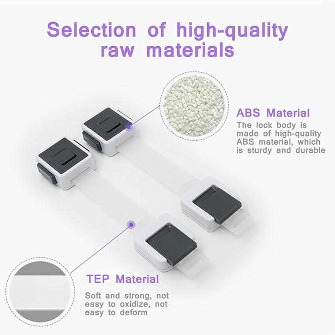 • Adjustable and Flexible: To enhance the suitability of the child proof cabinet door lock, this child locks for cabinets and drawers is designed to be adjustable length from 4.5” to 7.5”. and the strap of the toddler door lock are flexible, that allows latching around corners.