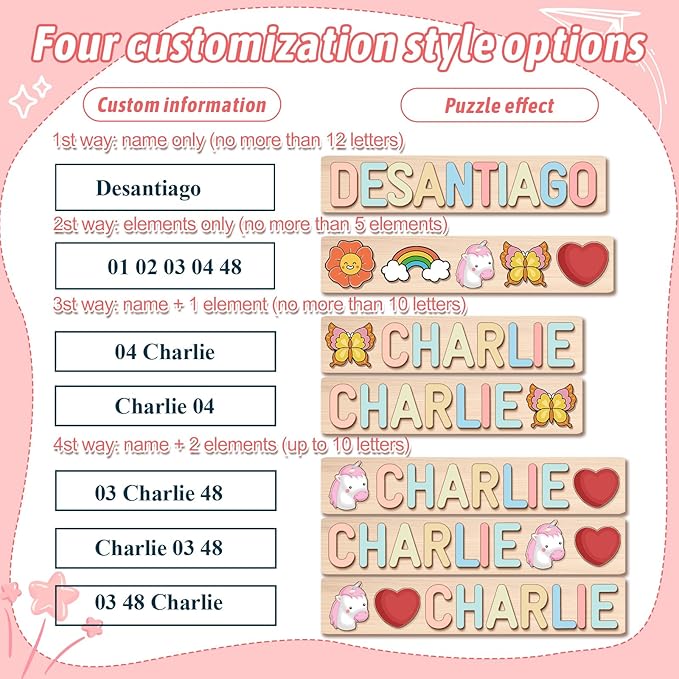 • 【Personalized Name Puzzle】 Personalized Wooden Name Puzzle just for your kids. Our puzzles are available in one, two and three line options, offering 100+ elements and we also provide 8 different color schemes to meet your different needs.
