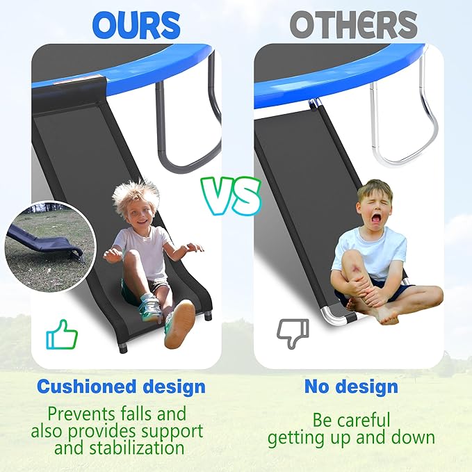 • 【HUMANIZED DESIGN】Deomod slide is designed with cushioning, so that your child's hips won't fall to the ground when sliding down, providing security for your child's safety, compared to a ladder, the use of the slide is more safe and reliable, which allows your child to slide safely on Deomod trampoline slides, creating unforgettable memories of laughter and unlimited fun