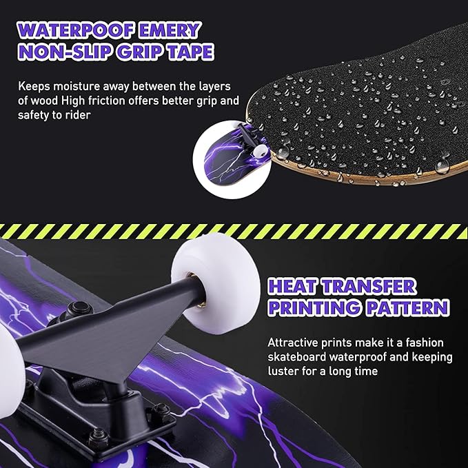 • Patterns Design: Personalized pattern design on the board is quite creative and eye-catching, you will definitely stand out among your friends across the different age range. Also, Skateboards pattern printed with thermal transfer printing process allows greater print durability, lasts much longer.