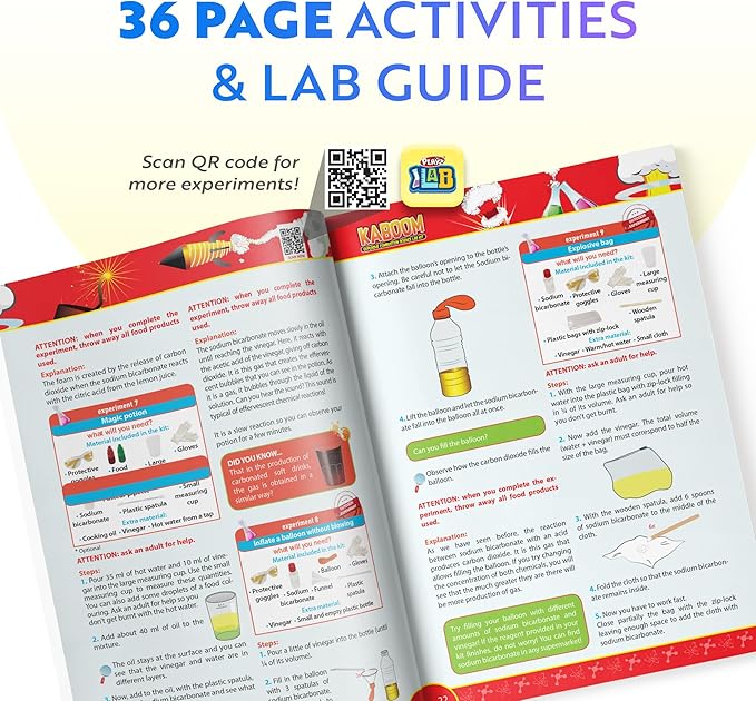 • LOADED WITH VALUE: Our educational science kit comes with 50+ KABOOM science experiments, from making balloon rockets from a chemical reaction, to creating their own fizzy bombs, to creating color explosions to exploding bags and much more!