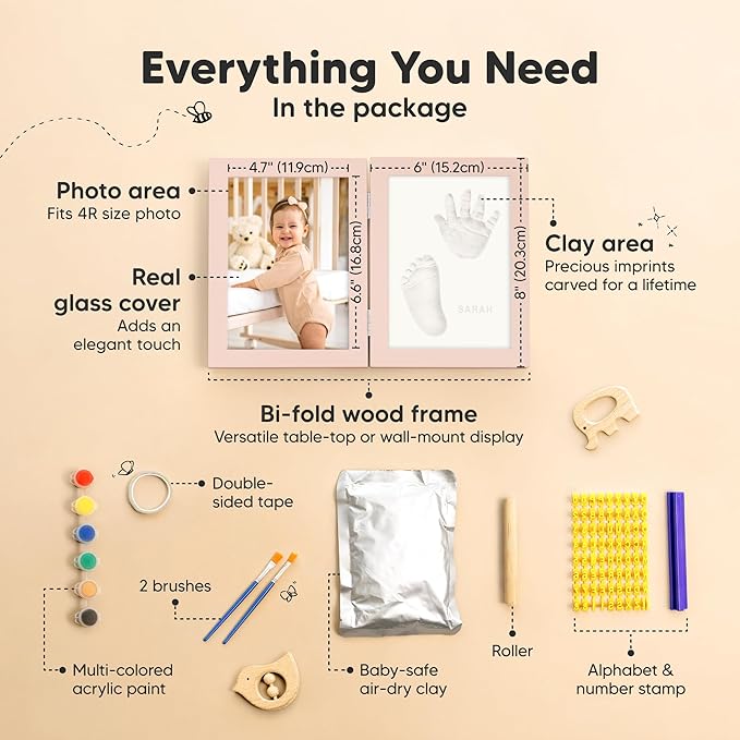 • All-in-one Baby Handprint and Footprint Kit - An elegant bi-fold Rune wooden frame with real glass cover, baby-safe air-dry clay, a wooden roller, alphabet stamps, paint and brush for personalization, and double-sided tape to keep it all in place.