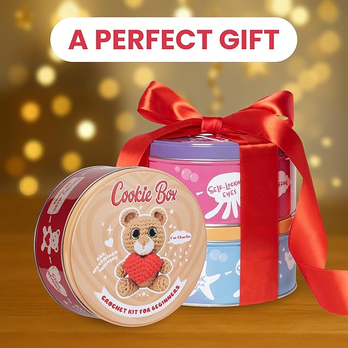 Cookie Box Crochet Kit for Beginners - Learn to Craft Amigurumi Stuffed Animals - Knitting Gift for Kids and Adults - Beginner-Friendly Yarn - Stitch-by-Stitch Video Tutorial - Bear Charlie