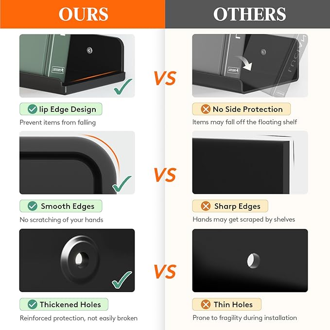 • 2 Ways to Install: The two hanging options are upward or downward. Acrylic shelves come with pre-drilled holes, detailed instructions, and all necessary mounting hardware, including screws, wall anchors, and bubble lever, which make installation simple and easy in just a few minutes.