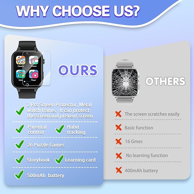 • 【Upgrade Kids Watch】As the upgrade kids smart watch with 2*screen protector, introduces the habit tracking function, stories, and learn card that traditional watches don't have, cultivating children's good habits and imagination. And with playable 26 games to choose from kids. These are suitable for children of multiple ages. That can effectively exercise kids brain and logical thinking ability. It is a perfect gift for 4-12 year old boys and girls.