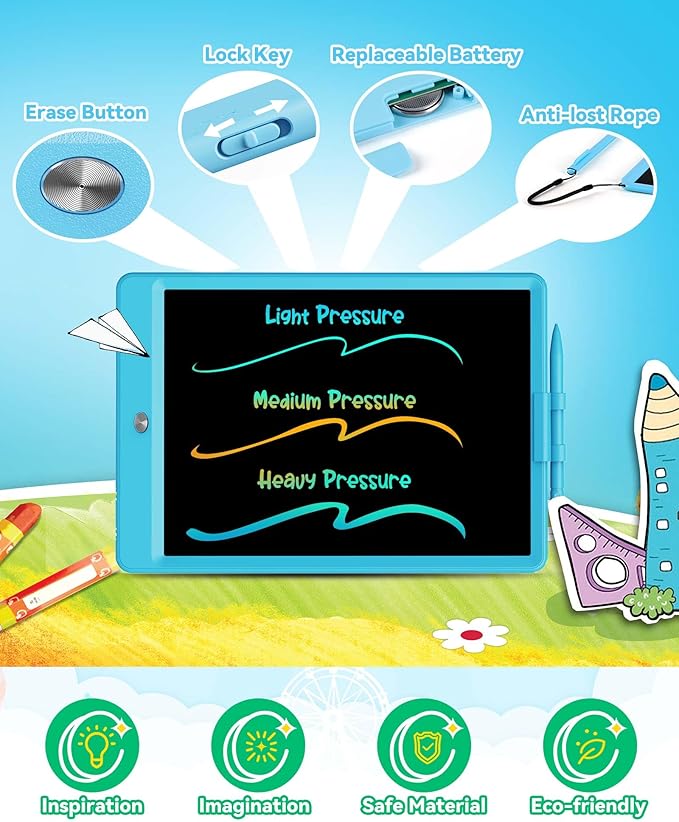 • [Reusable & Environmental]A reusable drawing tablet saves 1,000 sheets of paper. Our drawing boards are very eco-friendly because kids use these pads instead of paper. The writing tablet's battery can be used for 3-6 month and is replaceable. The battery is fixed with screws and are not easily accessible to young children.