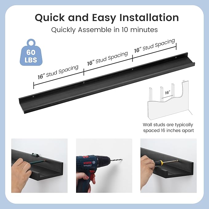 • Easy to Install: You will get a level, screws for the wall, drywall anchors, a detailed installation guide, and two beautiful hand-crafted solid pine wood shelves. With the level, you can make sure your picture ledge shelves are well aligned. Just follow the simple instruction to install the hanging shelves for wall decor within 10 minutes. We add additional screw and anchor to the hardware bag just in case. If you have any questions about our products, please feel free to contact us