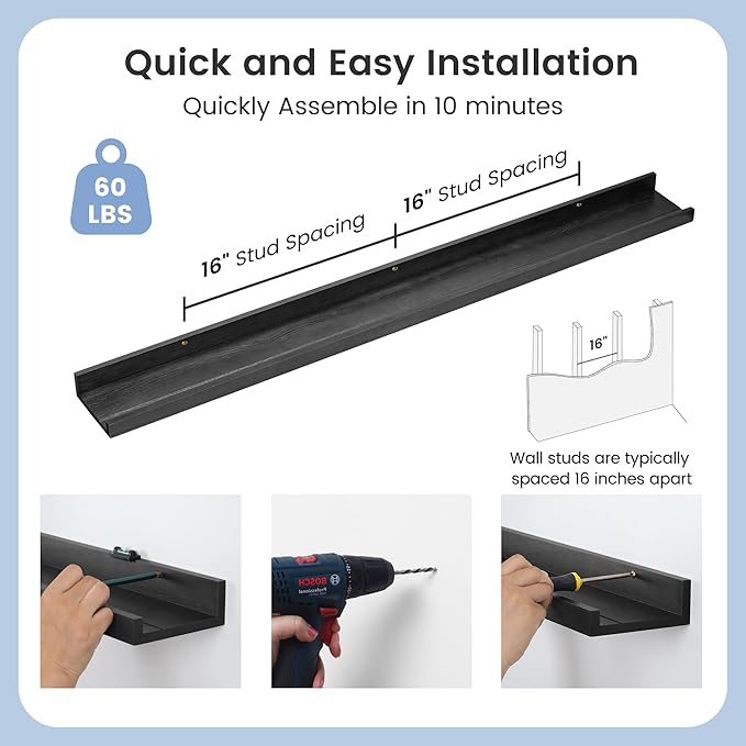 • Easy to Install: You will get a level, screws for the wall, drywall anchors, a detailed installation guide, and two beautiful hand-crafted solid pine wood shelves. With the level, you can make sure your picture ledge shelves are well aligned. Just follow the simple instruction to install the hanging shelves for wall decor within 10 minutes. We add additional screw and anchor to the hardware bag just in case. If you have any questions about our products, please feel free to contact us