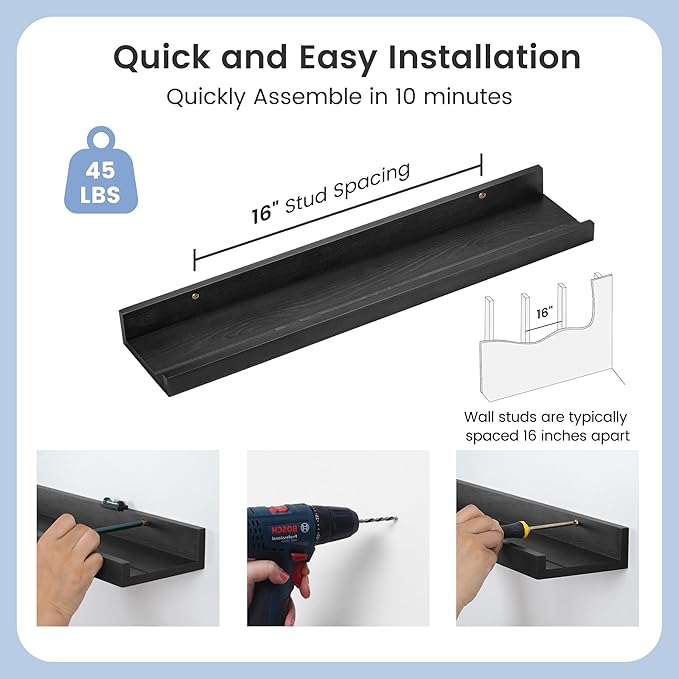 • Easy to Install: You will get a level, screws for the wall, drywall anchors, a detailed installation guide, and two beautiful hand-crafted solid pine wood shelves. With the level, you can make sure your picture ledge shelves are well aligned. Just follow the simple instruction to install the hanging shelves for wall decor within 10 minutes. We add additional screw and anchor to the hardware bag just in case. If you have any questions about our products, please feel free to contact us
