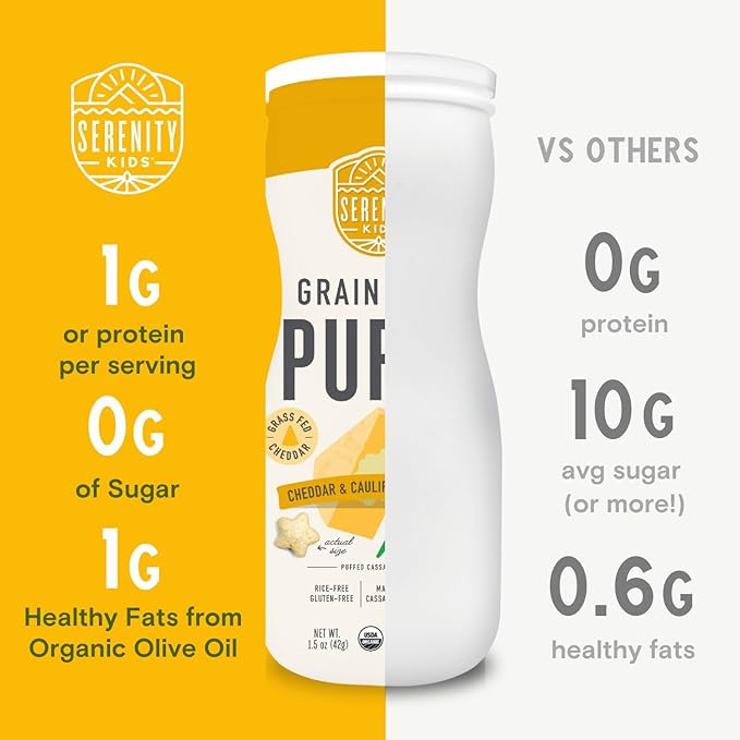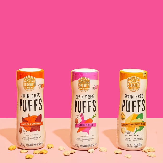 • SERENITY KIDS FUN TIME: We’re all about making snack time fun for kids and stress-free for parents with these yummy and nutritious puffs. This grain free puffs baby pack is a must-have for your baby's snack needs