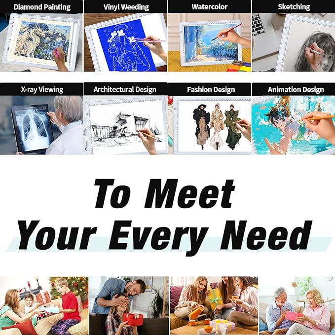 • 【3 Level Brightness Dimming】Short press the button to adjust 3 level Brightness.Sufficient light, suitable for your various creations.The surface of the light table is covered with a protective film. Remove the protective film before use to display the clearest brightness and surface.