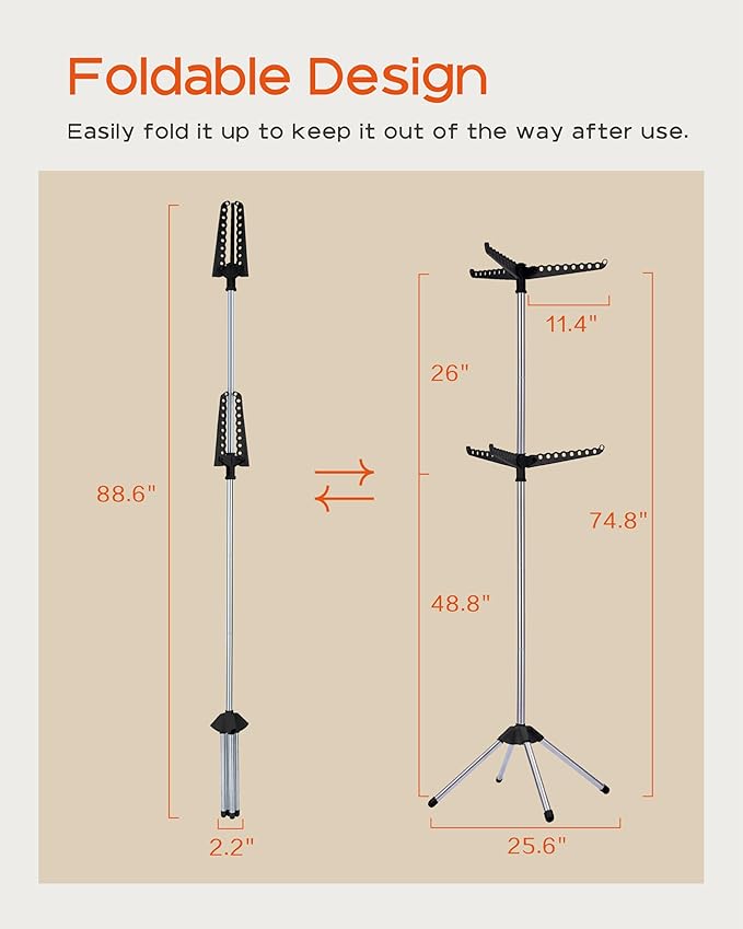 • [Foldable and Space-Saving] This vertical drying rack measures 25.6”D x 25.6”W x 74.8”H and takes up very little space. After use, simply fold the four legs and three drying rods into a smaller size: 2.2 "D x 2.2 "W x 88.6H, which can be leaned against the footrest, perfect for apartment laundry rooms or narrow spaces and corners.