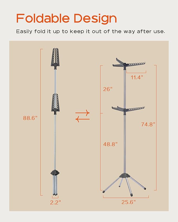 • [Foldable and Space-Saving] This vertical drying rack measures 25.6”D x 25.6”W x 74.8”H and takes up very little space. After use, simply fold the four legs and three drying rods into a smaller size: 2.2 "D x 2.2 "W x 88.6H, which can be leaned against the footrest, perfect for apartment laundry rooms or narrow spaces and corners.