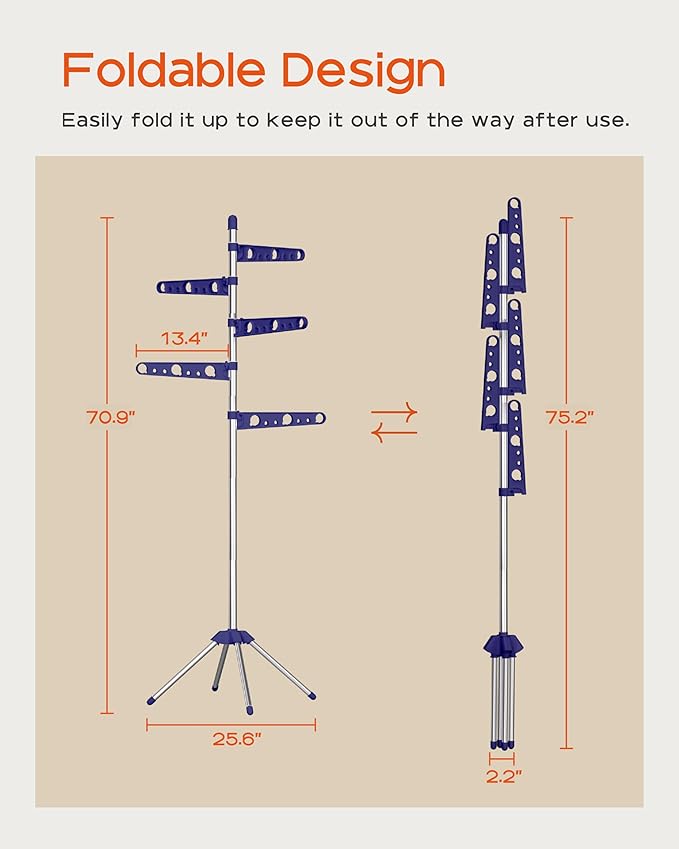 • [Foldable and Space-Saving] This vertical drying rack measures 25.6”D x 25.6”W x 70.9”H and takes up very little space. After use, simply fold the four legs and three drying rods into a smaller size: 2.2 "D x 2.2 "W x 75.2"H, which can be leaned against the footrest, perfect for apartment laundry rooms or narrow spaces and corners.