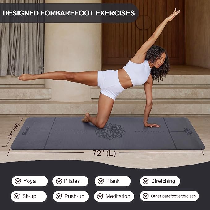 • Upgraded TPE Material: Crafted from premium TPE material, this big home gym mat is free from phthalates and has no unpleasant smell. Compared to NBR and PVC mat, TPE has a nice density. It provides ample cushioning without excessive sinking, aiding in the maintenance of balance during your practice