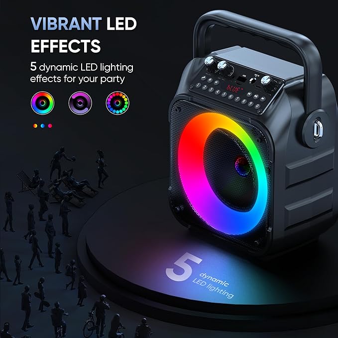 • TWS Mode and Brilliant Light Show: Bluetooth karaoke machine supports TWS function, which can realize the interconnection of two machines to form a dual-speaker karaoke system(The TWS function is only available for speakers, and microphone sound can only be emitted from the paired speakers). Dual-channel surround for stunning stereo sound. Our karaoke machine's 5 dynamic color modes. Whether you're hosting a lively indoor party or enjoying a backyard barbecue, effortlessly switch between mesmerizing 5 light effects that create an enchanting atmosphere. Enhance every note and beat, transforming every gathering into a memorable event