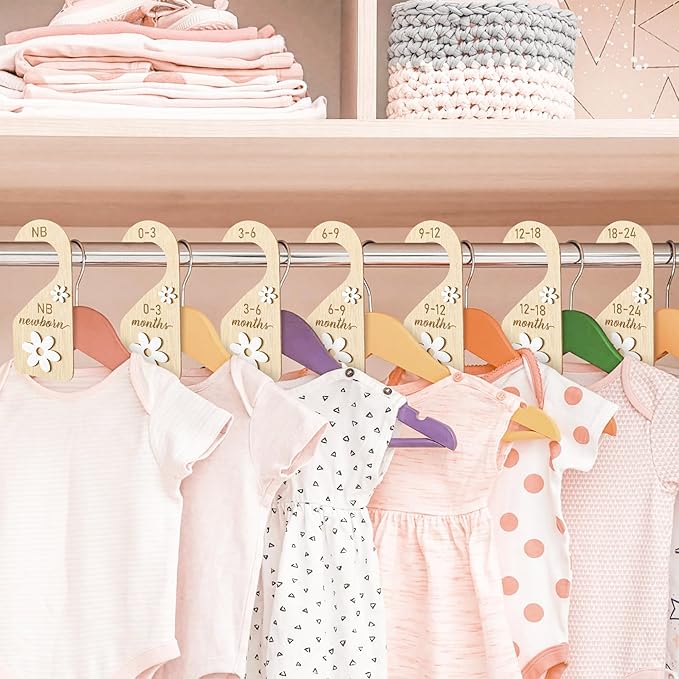 R HORSE Wooden Baby Closet Dividers - 8Pcs Double-Sided 3D Daisy Nursery Closet Organizer Baby Clothes Size Hanger Dividers Newborn Nursery Decor Birthday Gift for Boy Girl (0-24 Months)
