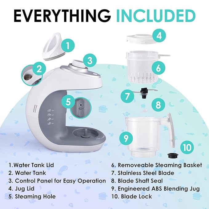 • MULTIFUNCTION BABY FOOD MAKER & STEAMER | It’s a Blender, Cooker & Baby Puree Maker All in One! Prepare Healthy Homemade Meals for Your Little One with an Appliance That Does it All Without the Messy Cleanup or Complicated Setup | Electric Baby Food Maker Features 6.76oz. Water Tank, 10oz. Blending Jug, Spill-Proof Cover, Lid, Steaming Basket & Blade