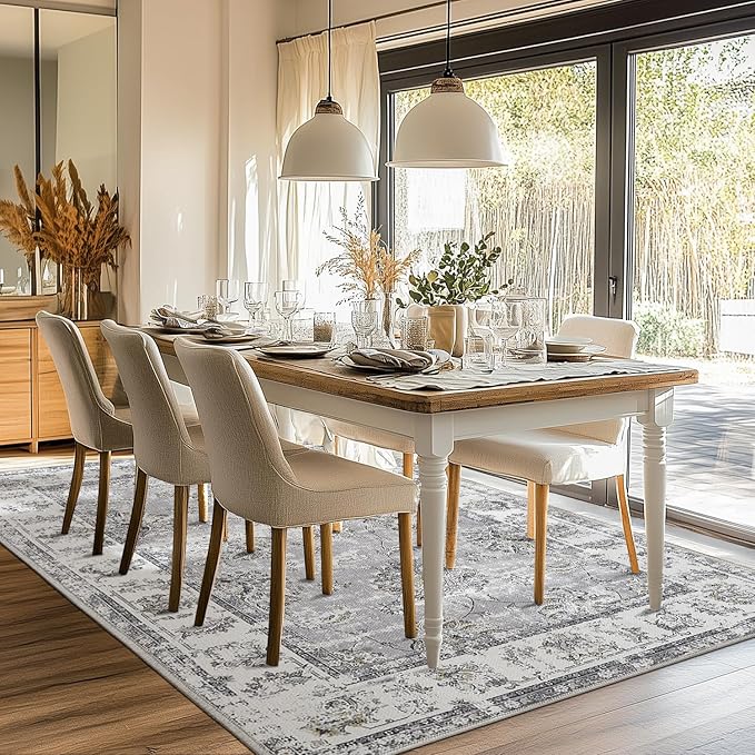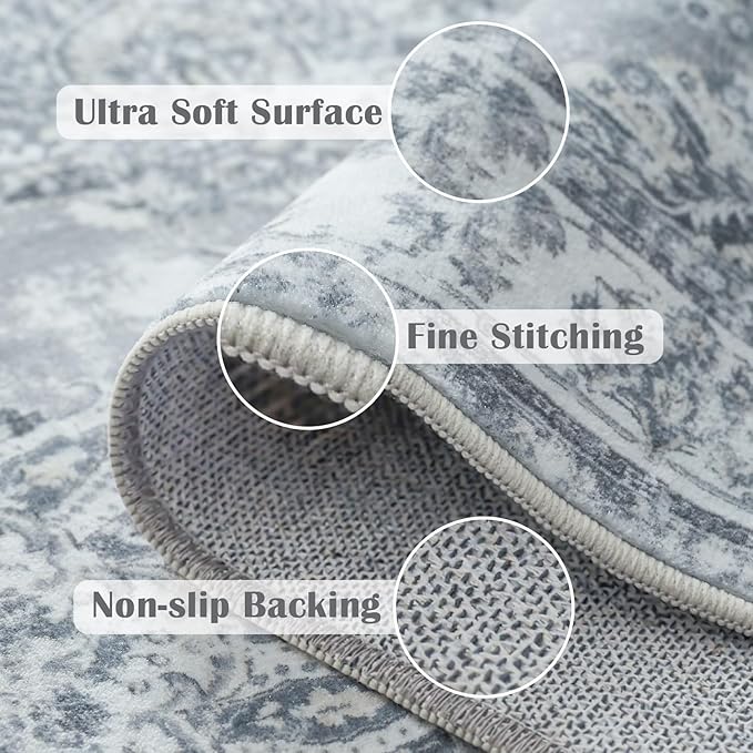 jinchan Washable Area Rug 8x10 for Living Room Soft Faux Wool Ultra-Thin Stain Resistant Non-Slip Distressed Vintage Floral Large Carpet for Bedroom,Dining Room,Home Office,Nursery(Grey, 8'x10')