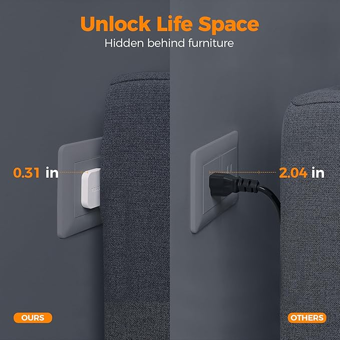 • Flat Plug Power Strip: With only 0.31 in ultra thin flat head design, 10 foot power strip long cord can easily fit in tight spots and hide behind sofa, bed or other furniture, sitting flush against the wall, keeping your house very clean and tidy; 45 degrees right angle design creates an extra space for other plug without any blocking