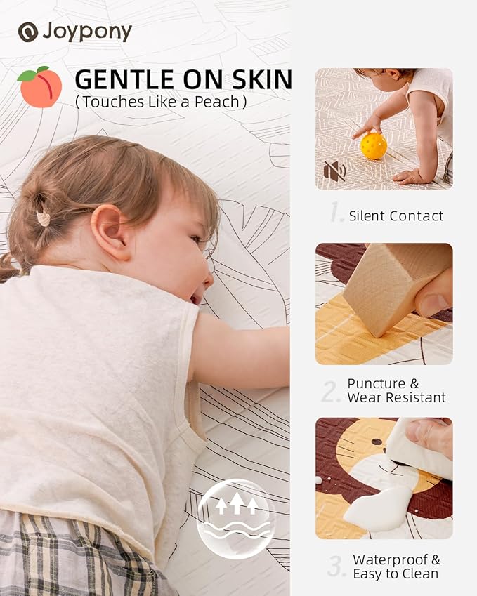 • 【Double-Sided Design, Double the Fun】One side of baby play mat innovatively uses breathable peach skin fabric, which is puncture-resistant, effectively reducing stickiness from sweat, while offering noise reduction, ideal for baby's rest. The other side features high-density XPE foam, with excellent wear resistance, and waterproofing,perfect for playtime. This dual-sided approach creates a safe, hygienic, and comfortable environment for the baby