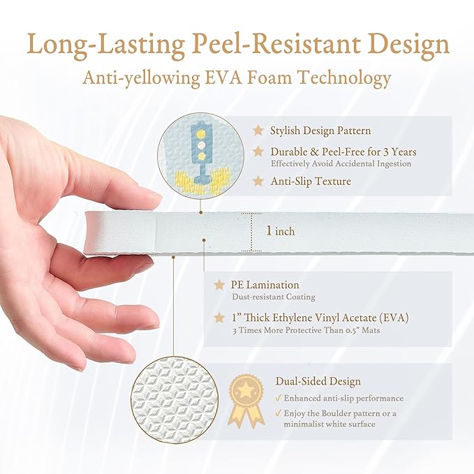 • 【Made from Safe Materials】Made from durable, shock-absorbing, odorless, and non-toxic EVA foam, our mats ensure safety and comfort. Using a unique printing method, it effectively addresses issues like sun fading and peeling that other brands often encounter, prevents small pieces from breaking off and being accidentally swallowed by babies, and enhances overall durability. With zero-benzene technology, it eliminates toxic odors found in many commercial products, ensuring non-toxic and safe floor mats.
