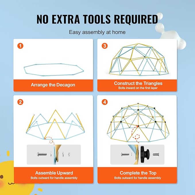 • Easy Setup: Everything you need is included, from installation tools to detailed manuals and video guides. Our clear instructions will effortlessly guide you through assembly, allowing you to quickly create a fun playground for your children with our kids climbing dome.