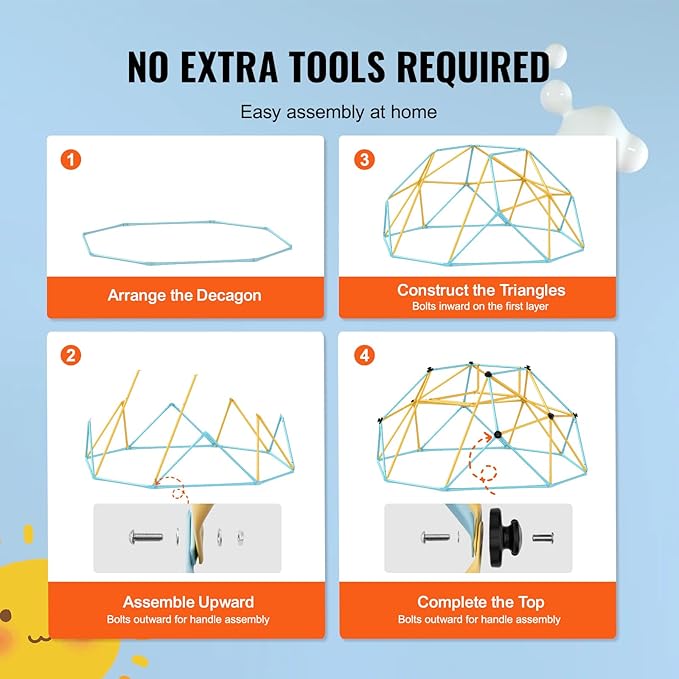 • Easy Setup: Everything you need is included, from installation tools to detailed manuals and video guides. Our clear instructions will effortlessly guide you through assembly, allowing you to quickly create a fun playground for your children with our kids climbing dome.