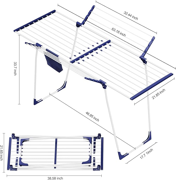 • Maximize Drying Space: The APEXCHASER clothes drying rack offers a generous drying space, measuring 63.217.733.7 inches, with 24 hanging rods, 10 clips, and 1 clip bag. The 2.4 inch spacing between rods gives efficient drying and accommodates all kinds of clothes easily.