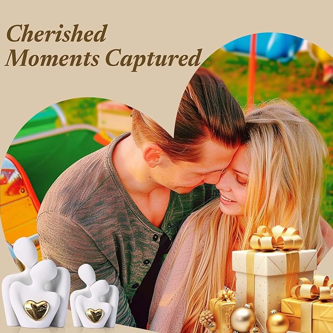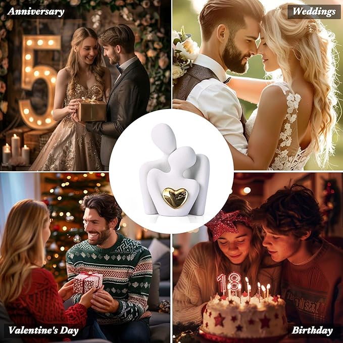 • Couples Bedroom Decor: This ceramic 'Hugging Couple Statue' embodies love and intimacy as the couple figurine shares a gaze, with a shining gold heart at the center, symbolizing a bright and precious bond. It's a mini yet impactful piece that brings a symbolic sparkle to any room, from the living room to the love office decor.