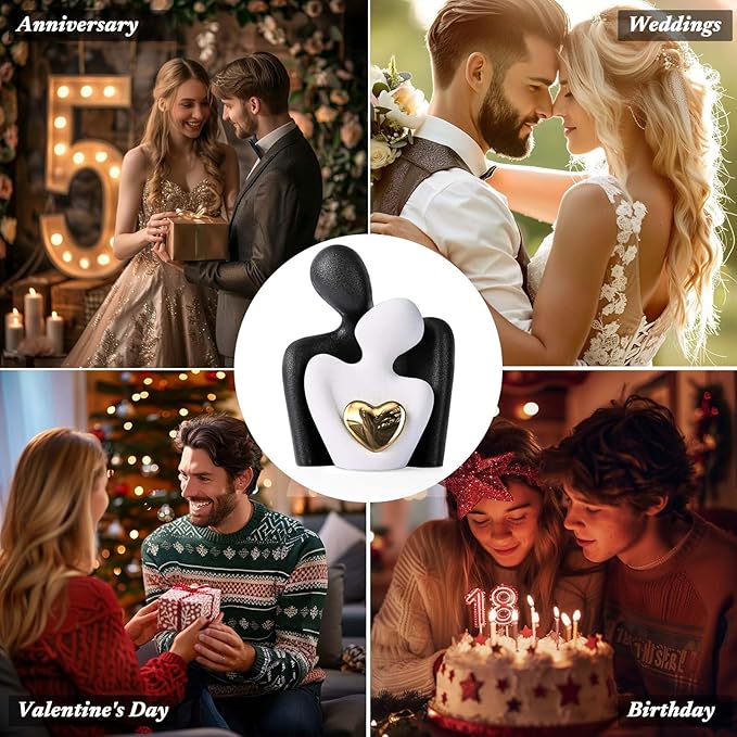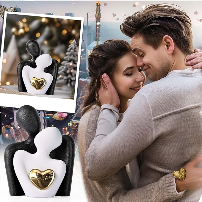 • Couples Bedroom Decor: This ceramic 'Hugging Couple Statue' embodies love and intimacy as the couple figurine shares a gaze, with a shining gold heart at the center, symbolizing a bright and precious bond. It's a mini yet impactful piece that brings a symbolic sparkle to any room, from the living room to the love office decor.