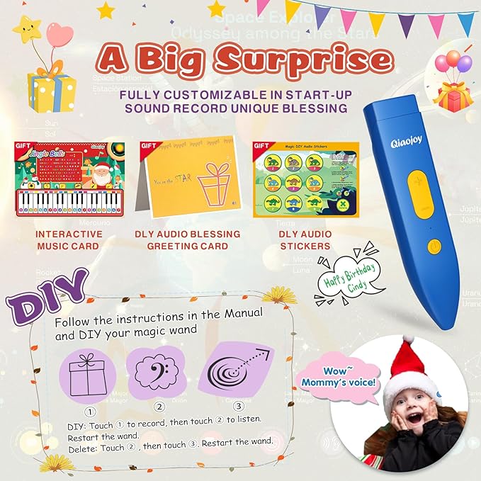 • Customizable Audio Pen for Creativity-This audio pen lets kids record their own stories, songs, or messages with custom startup sounds. The set includes a personalized voice gift card, where parents can record birthday wishes or special messages. It also features music cards and DIY dinosaur stickers, sparking creativity and imagination while making learning fun. Perfect for interactive play and personalized educational experiences, this is a great way to encourage self-expression.