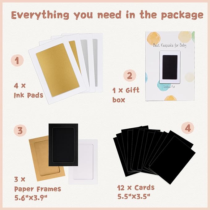 • 【Product Details】: Our baby hand and footprint kit measures 6.0"x4.2" with an ink window of 4.9"x3.1", which is the best size for recording hand and footprints of newborns 0-6 months old or pet paw prints . The ink pad for baby hand and footprints includes 4 clean touch ink pads, 12 stamping cards, and 3 display frames, ensuring you have ample opportunity to capture the best stamp.