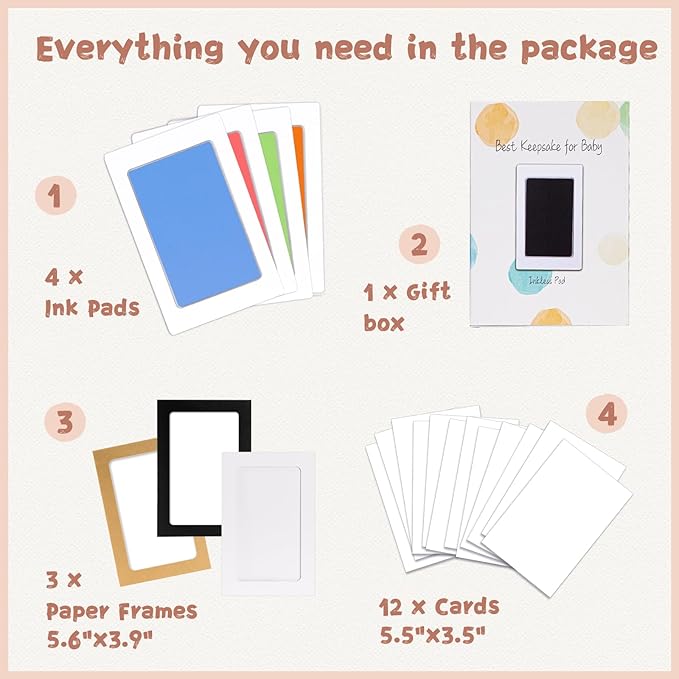 • 【Product Details】: Our baby hand and footprint kit measures 5.0"x3.2" with an ink window of 3.7"x2.3", which is the best size for recording hand and footprints of newborns 0-6 months old or pet paw prints . The ink pad for baby hand and footprints includes 4 clean touch ink pads, 12 stamping cards, and 3 display frames, ensuring you have ample opportunity to capture the best stamp.
