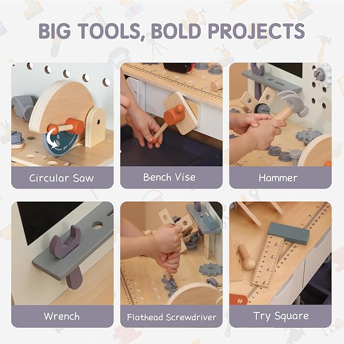 • Safety and Durability - Crafted from high-quality natural wood, this workbench is built to last. High Quality materials and smooth edges ensure that children can play safely, while the sturdy construction withstands rough play, making it perfect for young builders