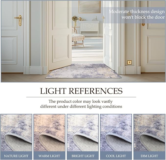 • Tides Series – Effortless style that flows with your life.This modern machine-washable non-slip rug features reinforced edges and a low-pile design that resists dirt. Its water-repellent surface makes spills easy to clean - liquids bead up for quick wiping. Simply machine wash in cold water (no bleach) to refresh. The non-slip backing keeps it securely in place. A perfect blend of function and contemporary design for active homes.