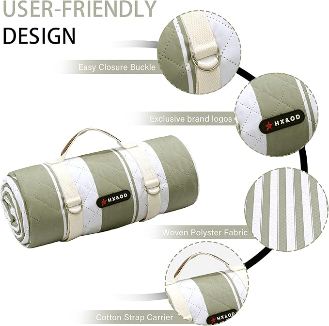 HX&OD Outdoor Picnic Blanket Extra Large, 80''*60'' Waterproof Picnic Mat with Stakes Foldable Camping Blanket Portable with Carry Strap for Beach Mat (Green& White, 80''*60'')