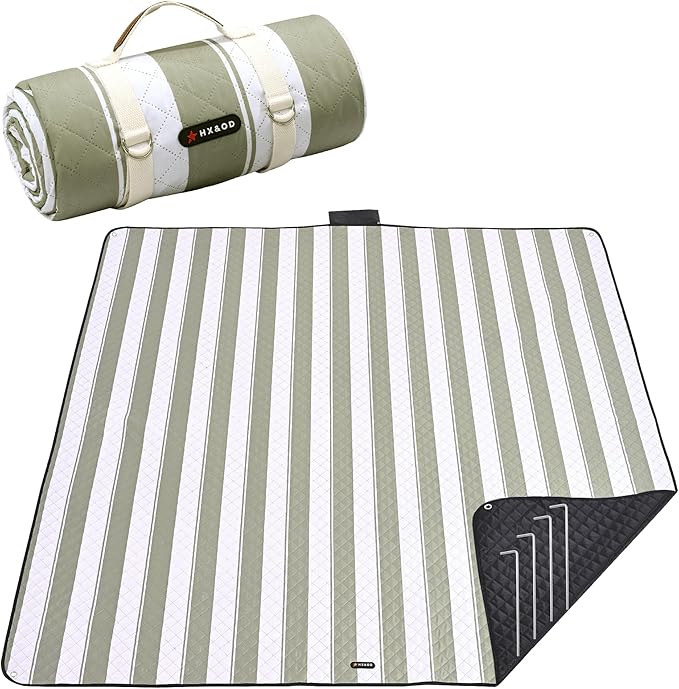 HX&OD Outdoor Picnic Blanket Extra Large, 80''*80' Waterproof Picnic Mat with Stakes Foldable Camping Blanket Portable with Carry Strap for Beach Mat (Green, 80''*80'')