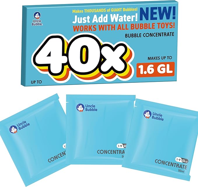• 【CUSTOMIZE YOUR BUBBLES】- Our bubble liquid comes with detailed instructions on how to create various bubble sizes by adjusting the dilution ratio. Whether you want giant bubbles, regular bubbles, or professional show of bubble artist, Uncle Bubble has you covered. This box with 3 pouches concentrated solution can be diluted up to 1.6 gallons, offering versatility for any occasion.