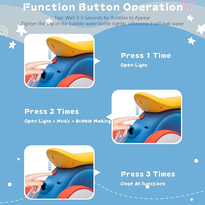• Multi-functional Kids Balance Bike for Children to Play: The thoughtful design includes bubble devices, light effects, music functions, and whistles, adding more fun to the driving experience. Parents can ensure safe driving directions using the remote control. The use of plastic material instead of metal makes the ride-on toy lighter, more compact, and easy to store and carry. The non-slip, wear-resistant wheels are gentle on floors and allow the baby to ride indoors or outdoors.