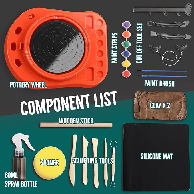 • 🏺8 DIFFERENT SCULPTING TOOL HEADS - The complete pottery kit comes with everything kids need to get started easily, including Pottery wheel, Clays, Cut off tool set, Sculpting tools, Wooden sticks, Paint colors, Sponge, Spray bottle and a Silicon mat.