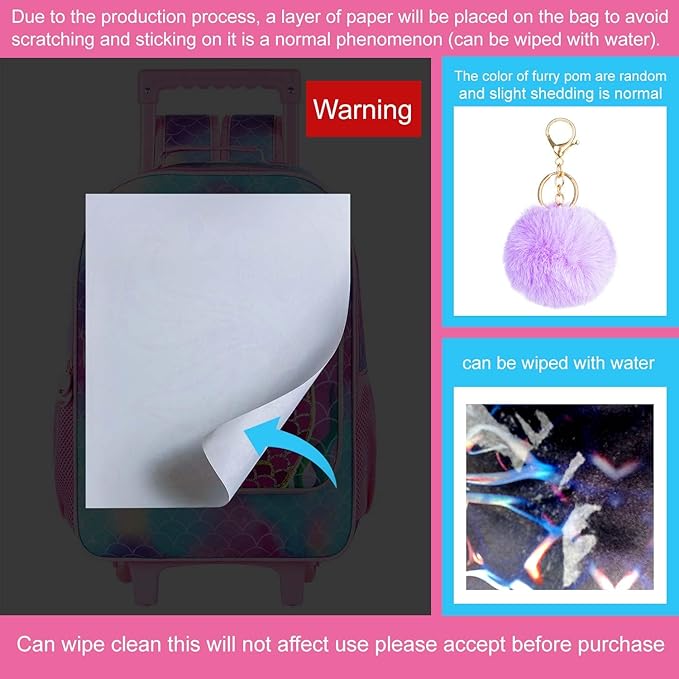 • Eye-Rabbitching Design: This girl rolling backpack is made ofnew uv printing technology, interesting and fun, the cute rabbit shines. The high quality eco-friendly water-resistant fabric makes kids wheeled backpack perform better.