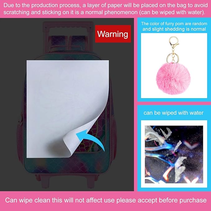 • Dog Rolling Backpack Details: Reinforced side mesh pockets and strap links, padded and breathable shoulder straps, smooth double zipps, these designs make the kids roller backpack for girls more durable.