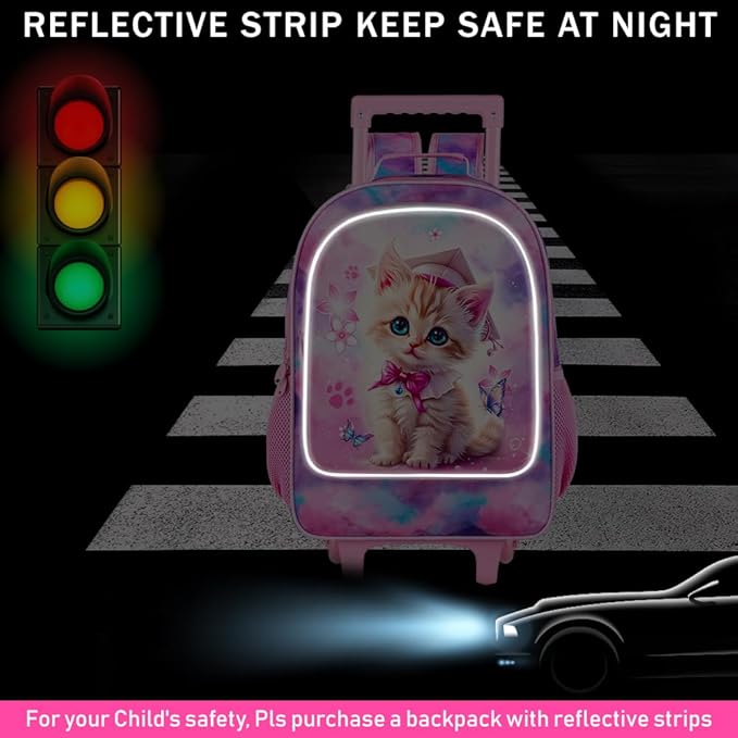 • Eye-Catching Design: This girl rolling backpack is made of new uv printing technology, interesting and fun, the cute cat shines. The high quality eco-friendly water-resistant fabric makes kids wheeled backpack perform better.